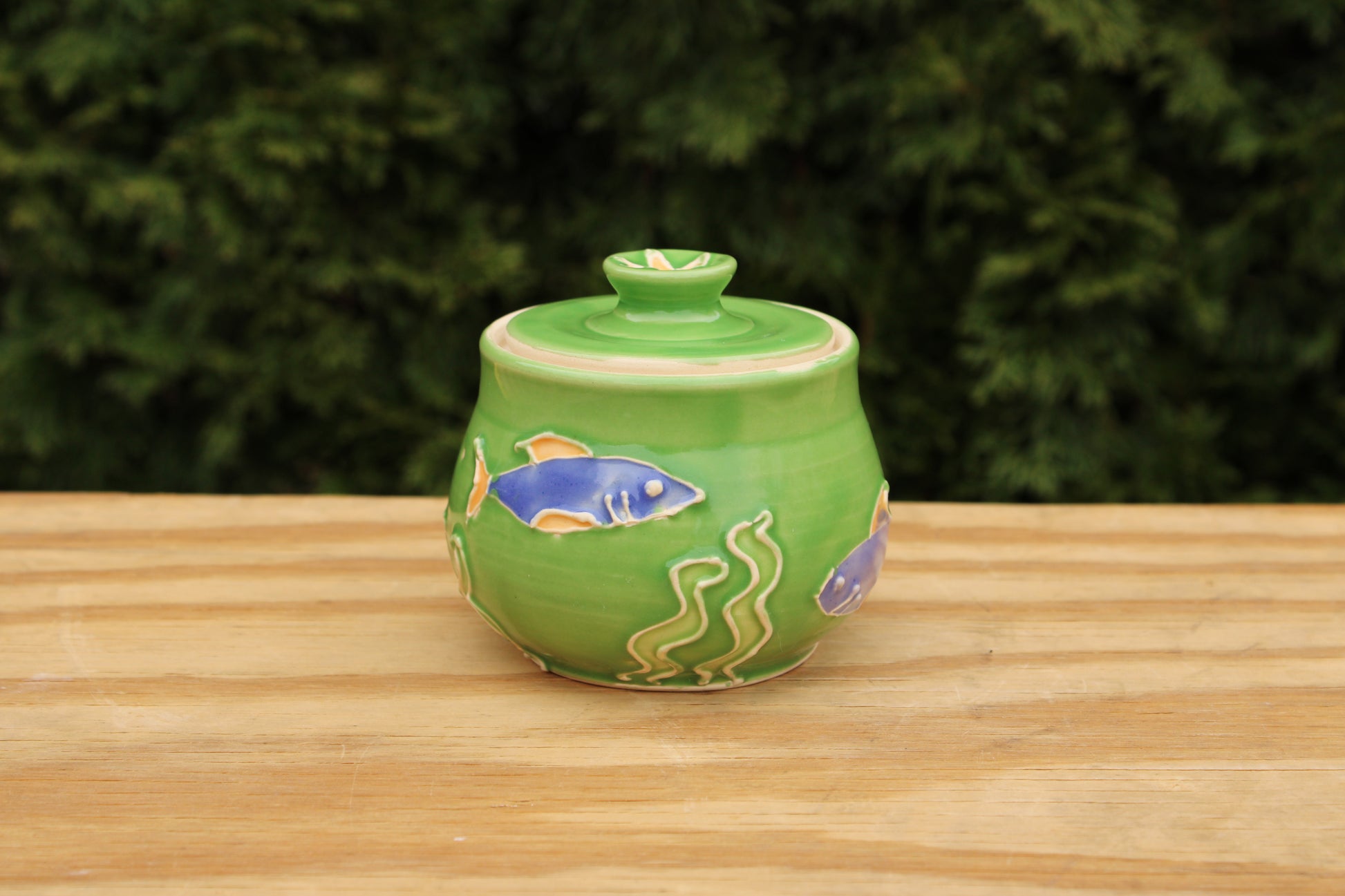 Small porcelain jar with slip-trailed design. Perfect for salt or sugar.