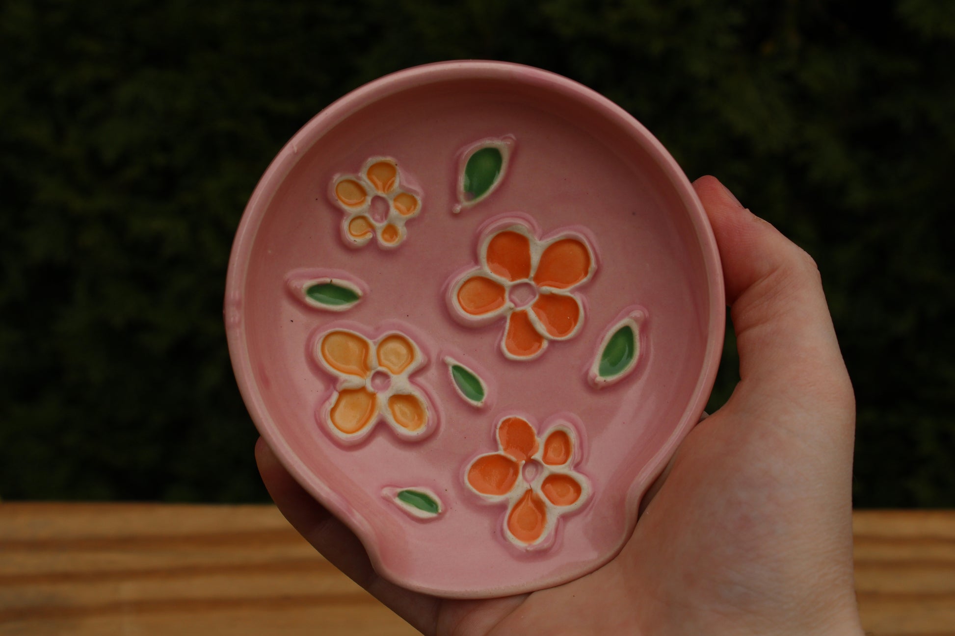 Dish for placing spoons and other utensils while cooking with slip trailing design