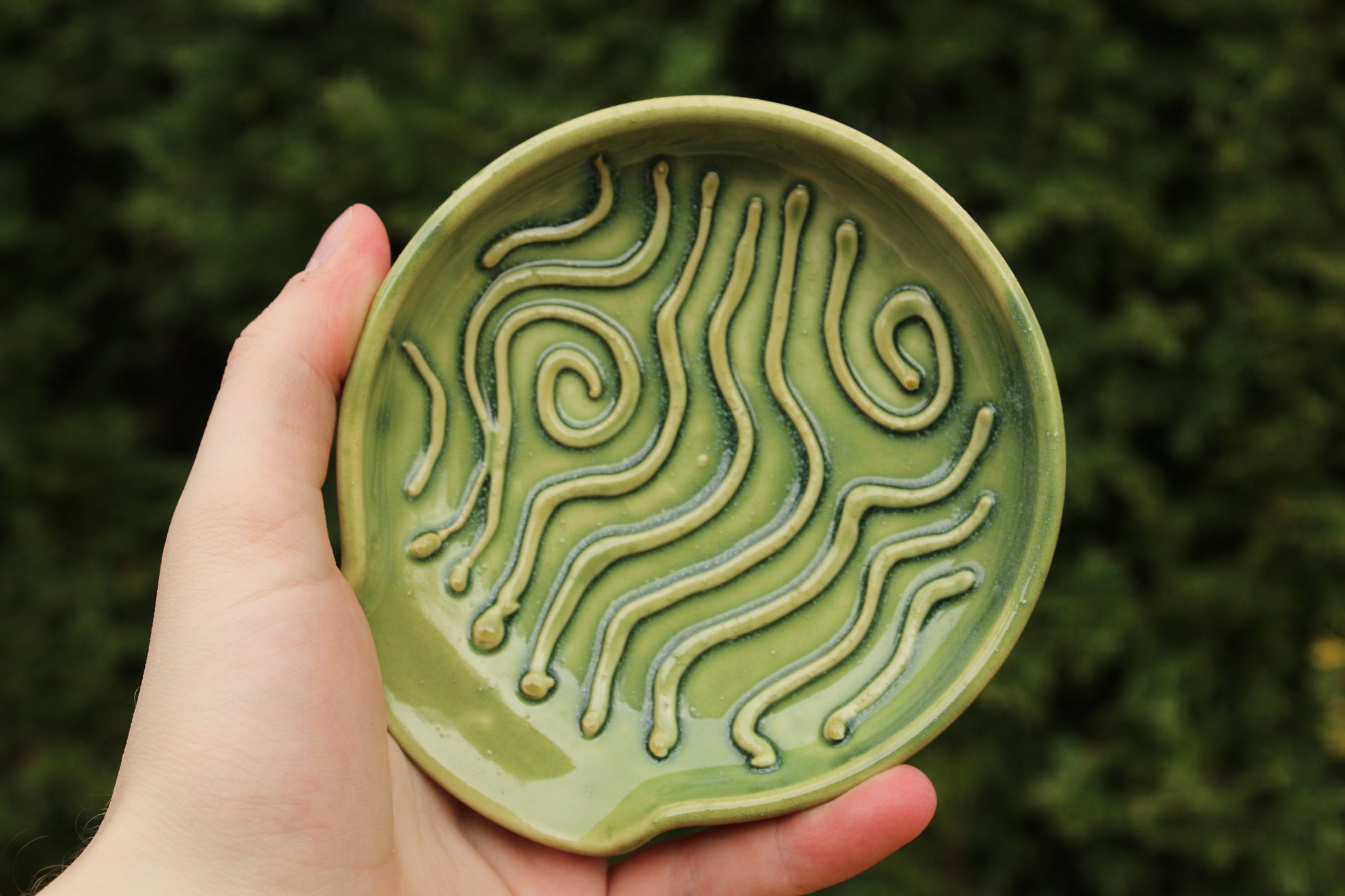 Dish for placing spoons and other utensils while cooking with slip trailing design