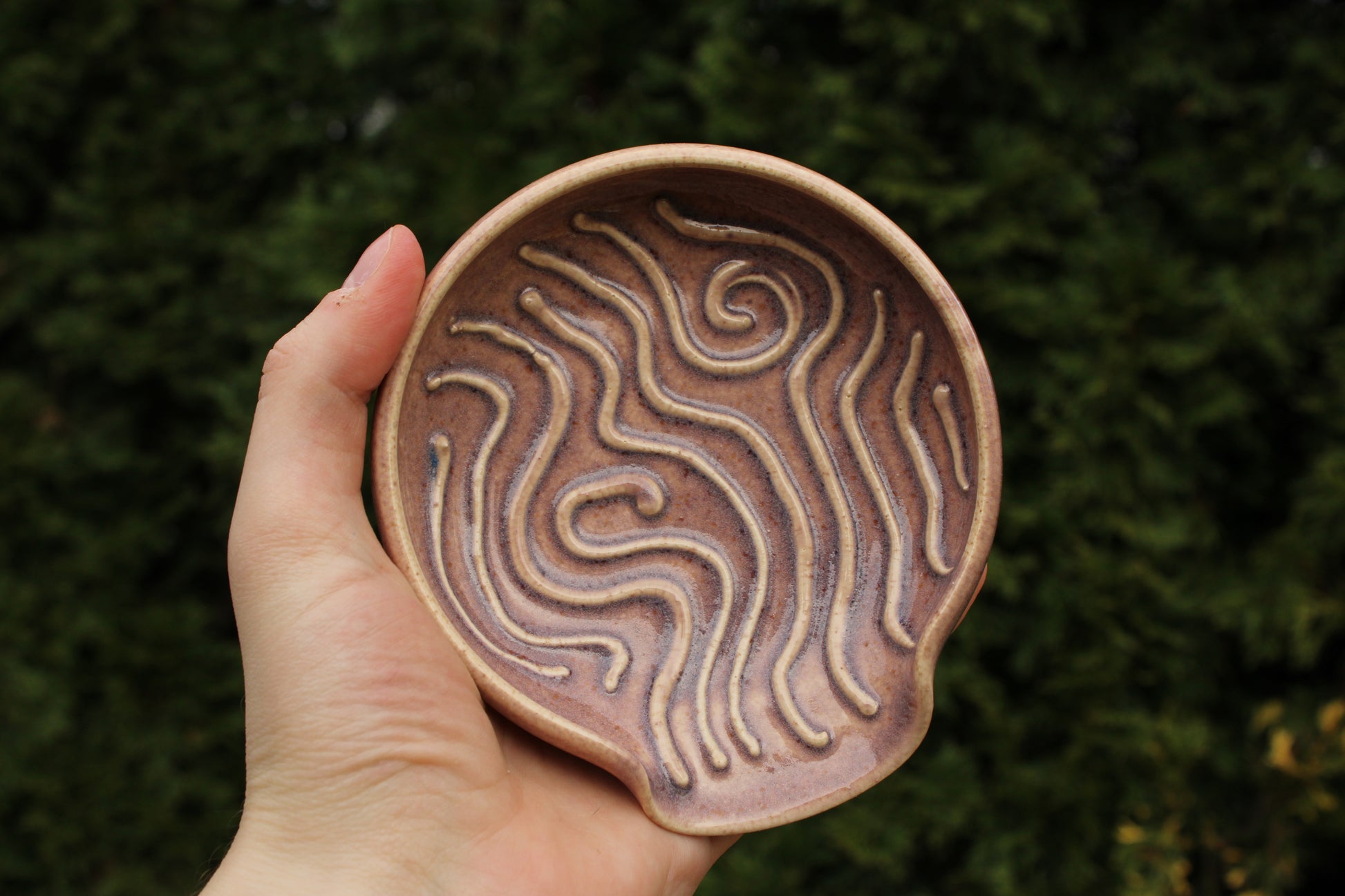 Dish for placing spoons and other utensils while cooking with slip trailing design
