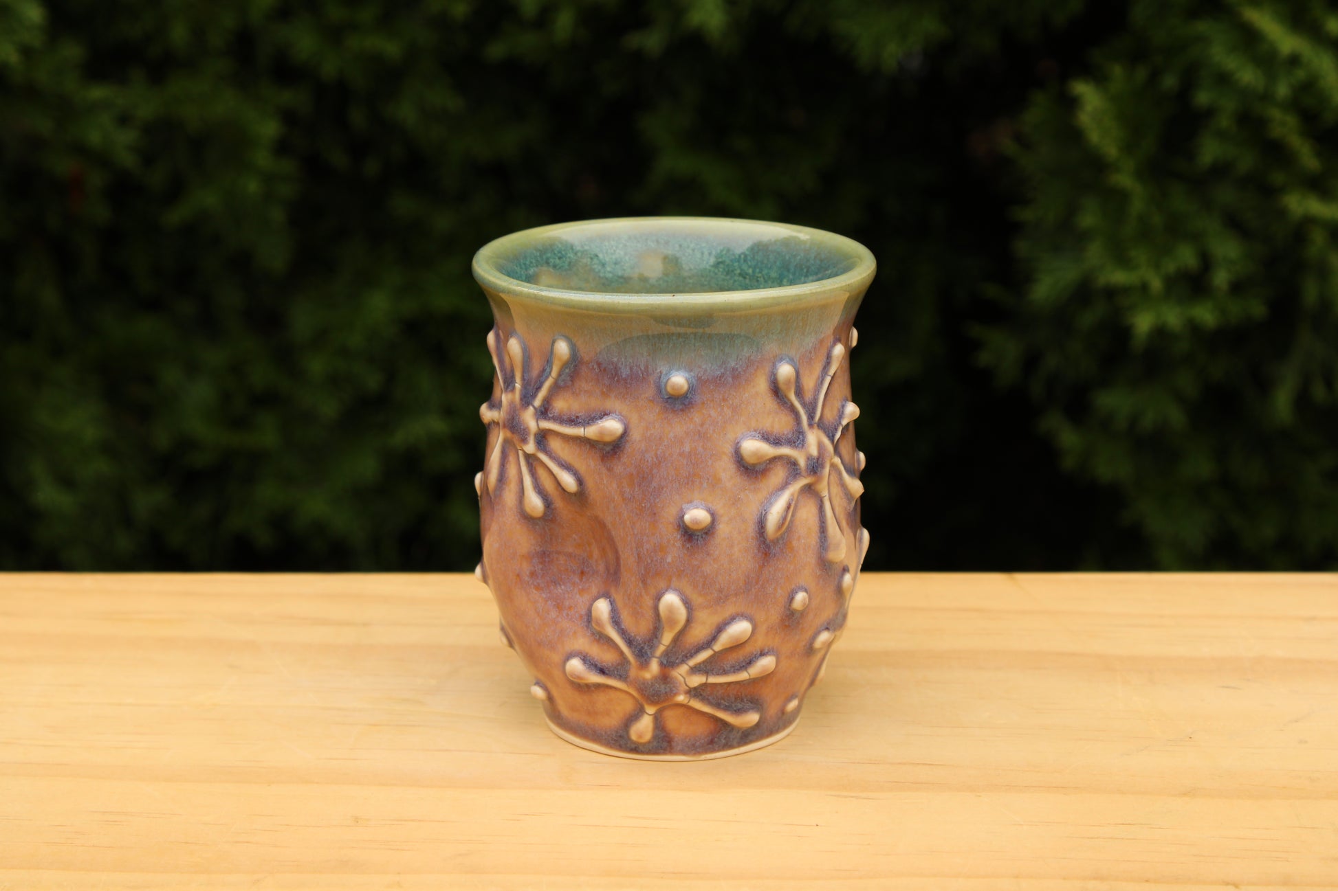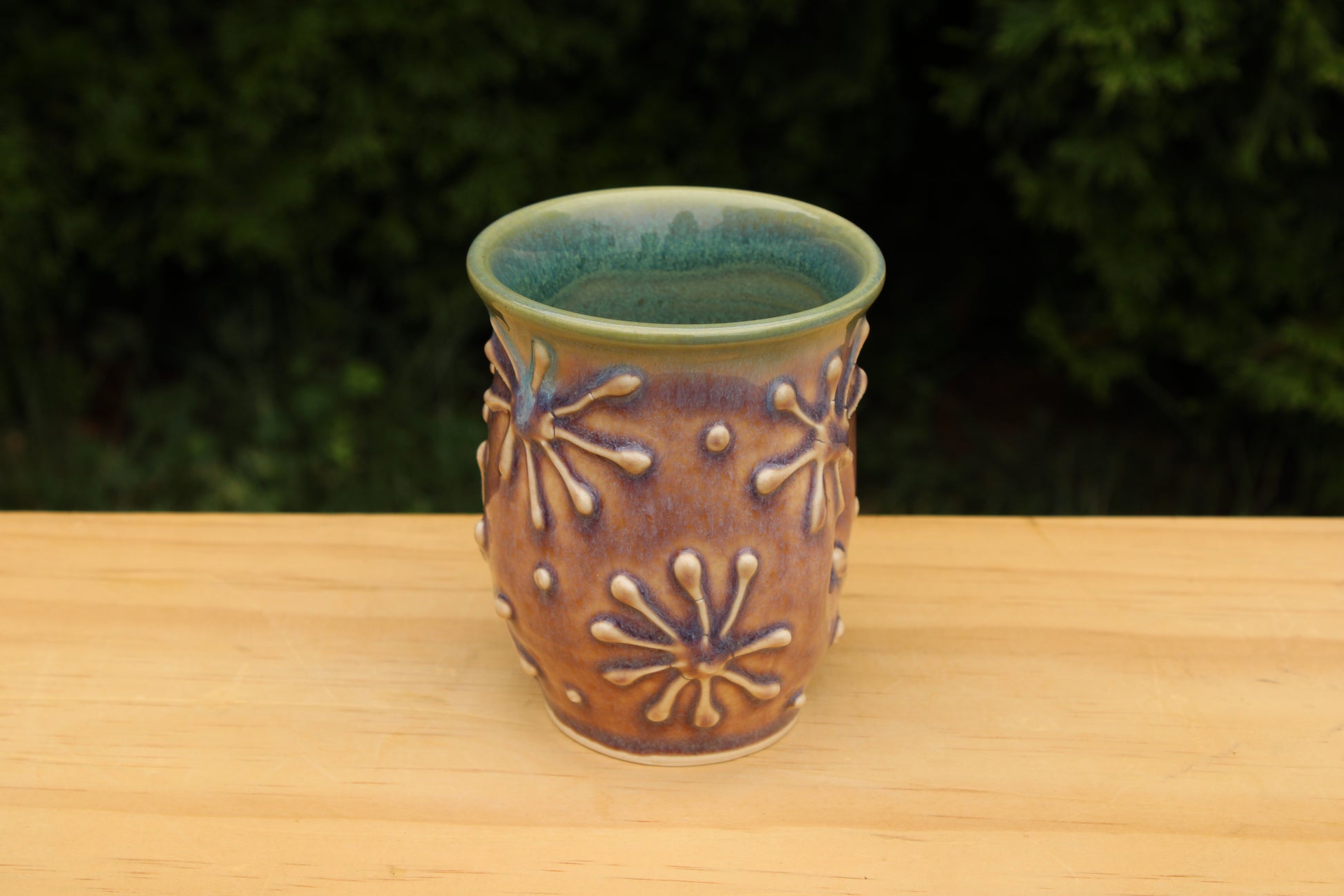 Cup with thumb indent and slip trailed line design.